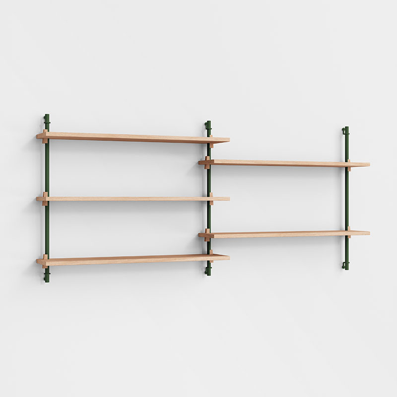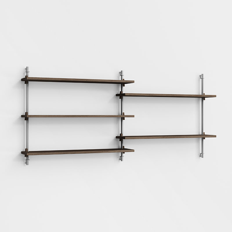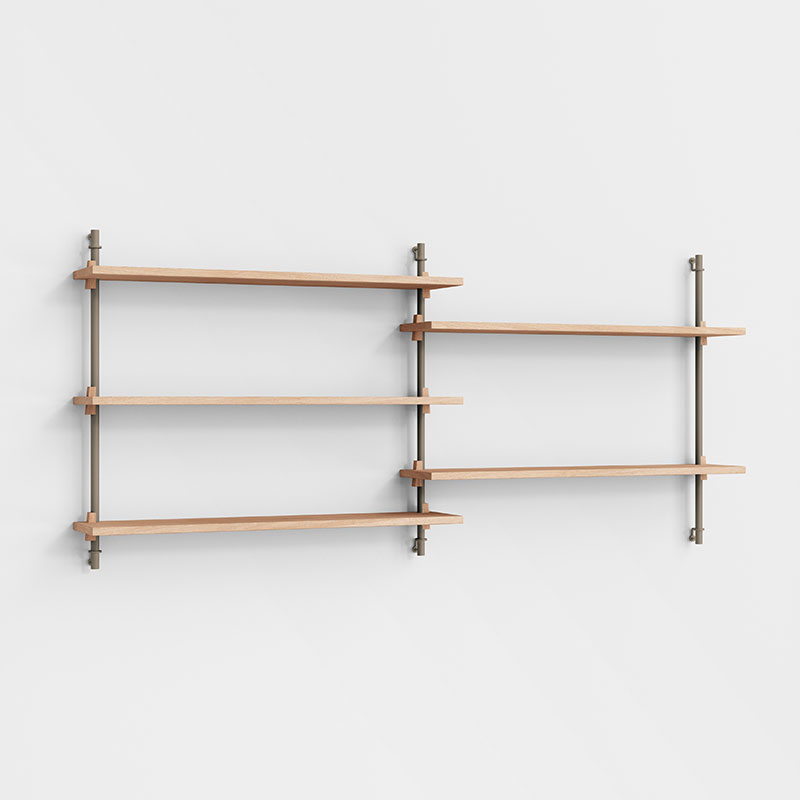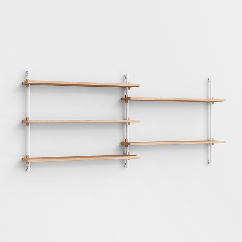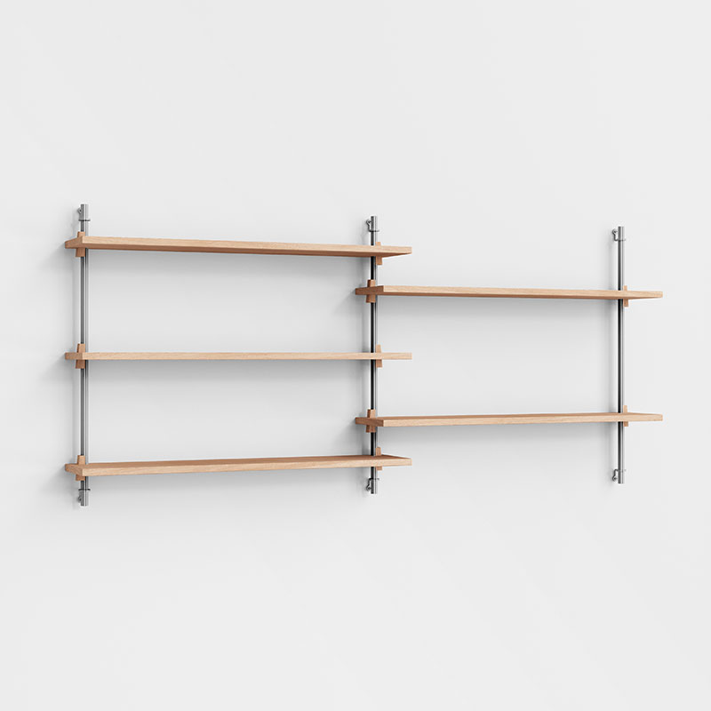 MOEBE WS.65.2は、壁に取り付けて使用するモジュール式の収納システムです。質の良いオーク材の棚板とスチール製のフレームで構成され、軽やかでありながら高い安定性を備えています。棚板を「楔(くさび)」のようなストッパーで固定する独自の構造を採用しており、設置した後でも無段階で高さを調整できます。 また、必要に応じて棚板や支柱を追加して、横にも縦にも自在に拡張することができます。