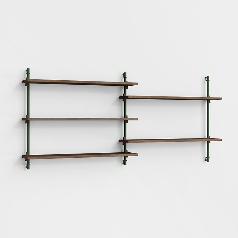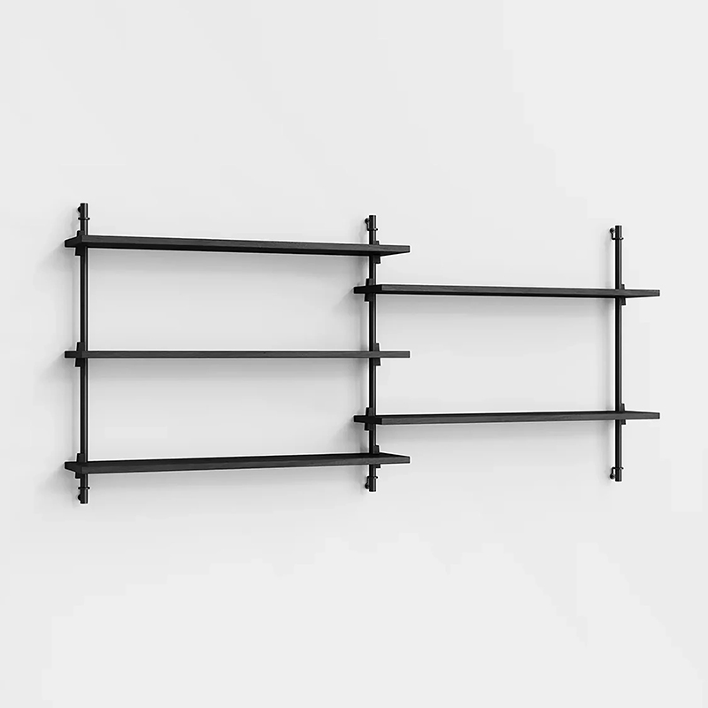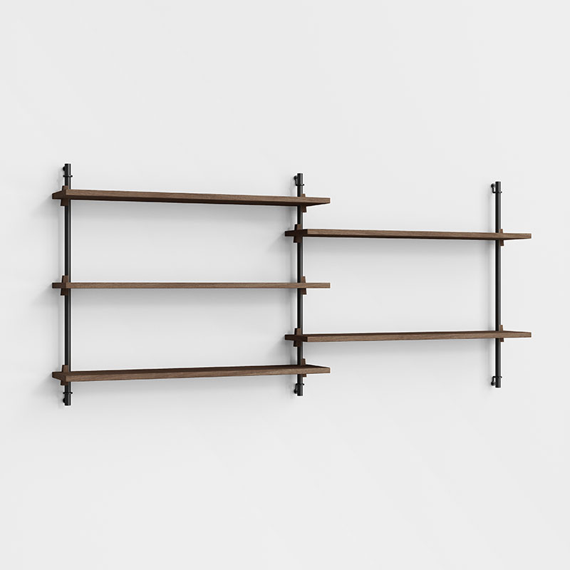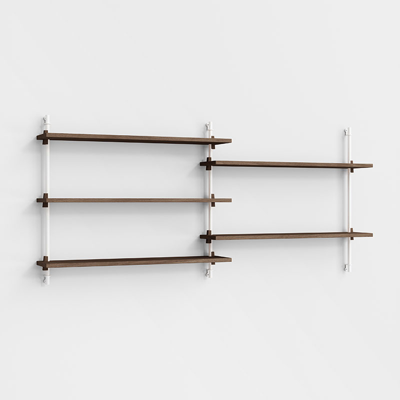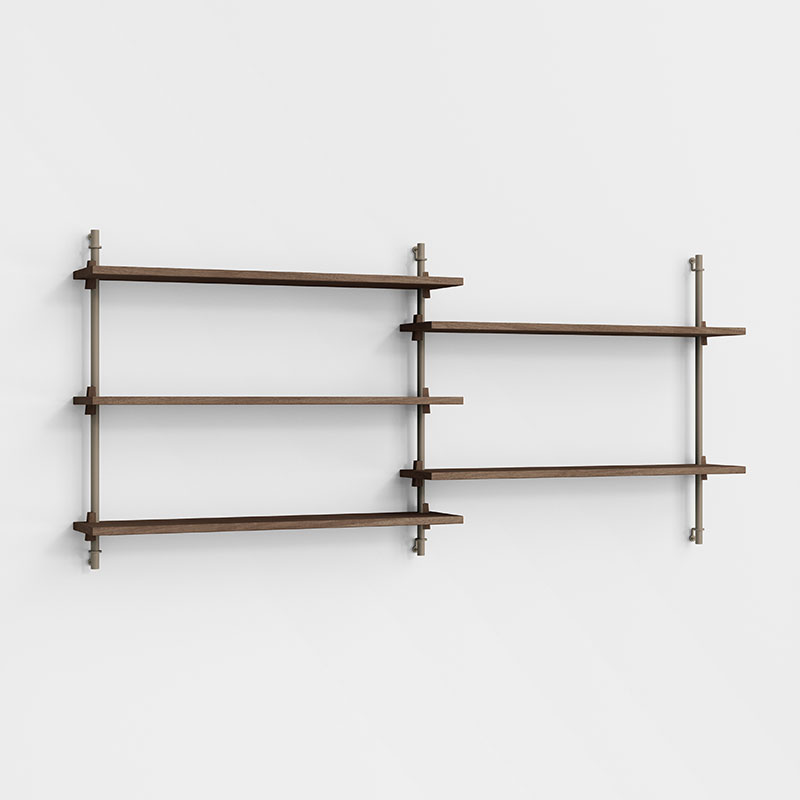 MOEBE WS.65.2は、壁に取り付けて使用するモジュール式の収納システムです。質の良いオーク材の棚板とスチール製のフレームで構成され、軽やかでありながら高い安定性を備えています。棚板を「楔(くさび)」のようなストッパーで固定する独自の構造を採用しており、設置した後でも無段階で高さを調整できます。 また、必要に応じて棚板や支柱を追加して、横にも縦にも自在に拡張することができます。